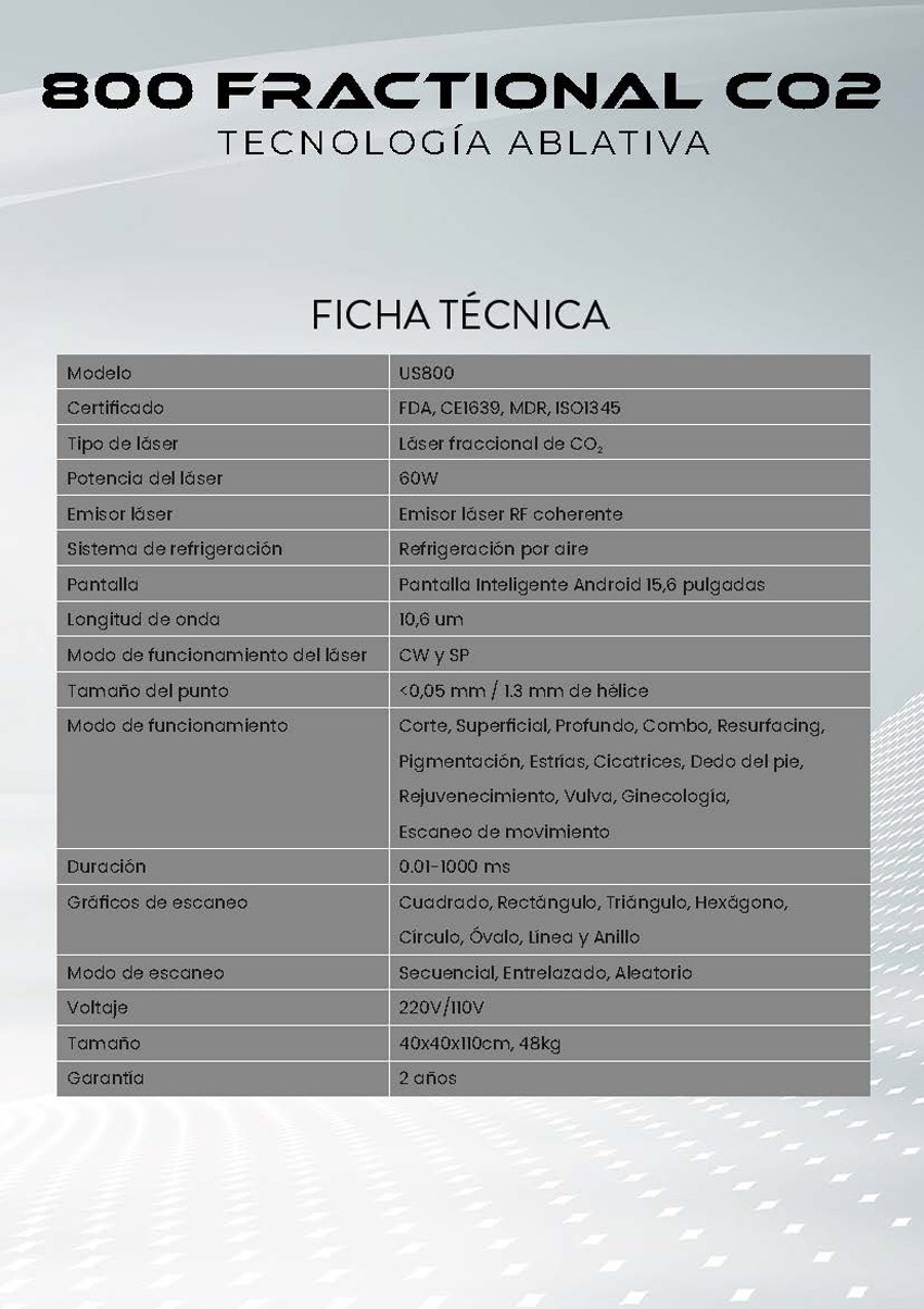 El Láser 800 Fractional CO2 (láser de CO2 fraccionado) es una plataforma de última generación diseñada para aplicaciones en dermatología estética, cirugía menor y ginecología funcional. Su principio de acción se basa en la emisión de una longitud de onda de 10.600 nm, altamente absorbida por el agua intracelular, lo que permite una ablación precisa del tejido con mínima afectación térmica circundante.